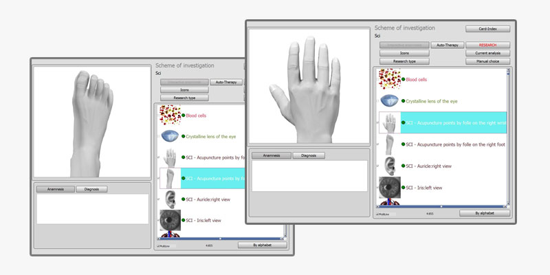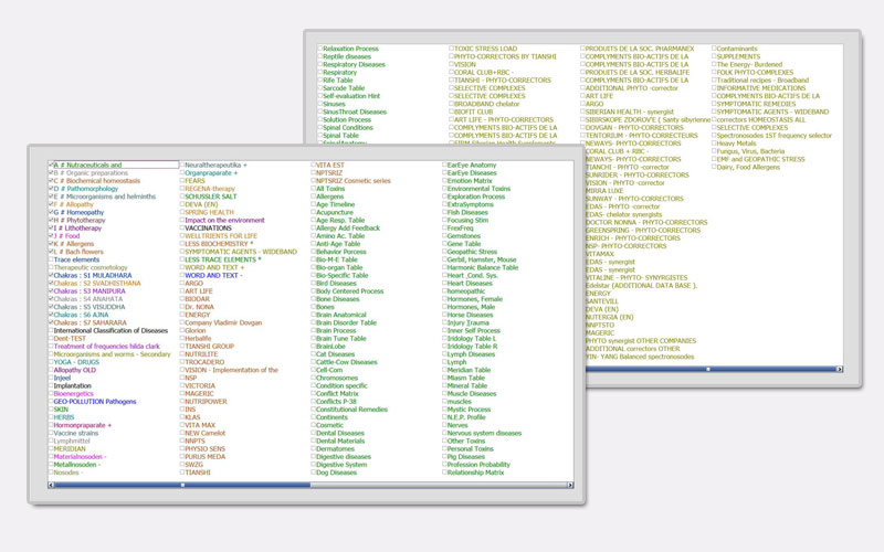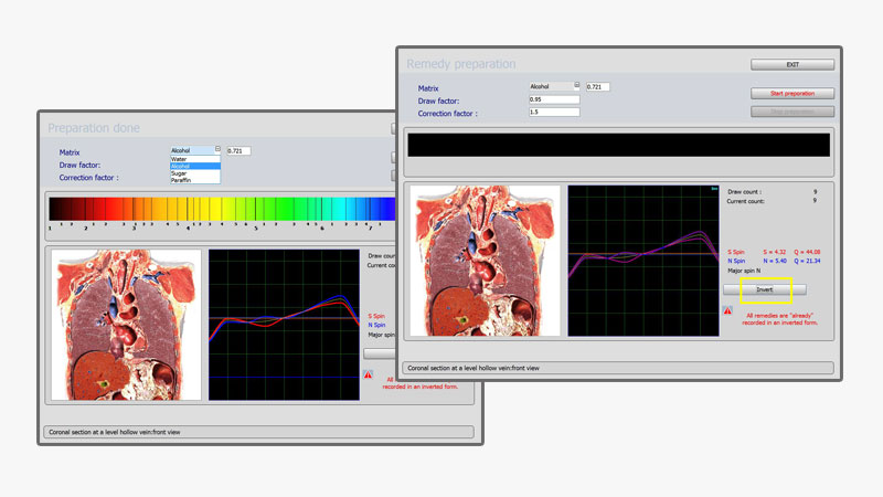 The function ‘Reprint’ also works along the principles of bio-resonance. A ‘Reprint’ is a ‘copy’ composed of frequencies at disposal in the database, frequencies specific to the organ treated. It is possible to charge a liquid with this Reprint of frequency. The client should absorb these frequencies during several weeks. When the liquid is charged, the frequencies are inverted (do not invert medication frequencies and in general all the positive things), thus the opposite of the ‘incorrect’ measurements. It is thus possible to bring the functions of the organs towards frequencies approaching the structural frequencies (bringing the curves closer together). Microorganisms, diseases, pathologies and in general all negative things can be placed inversed in a medium.