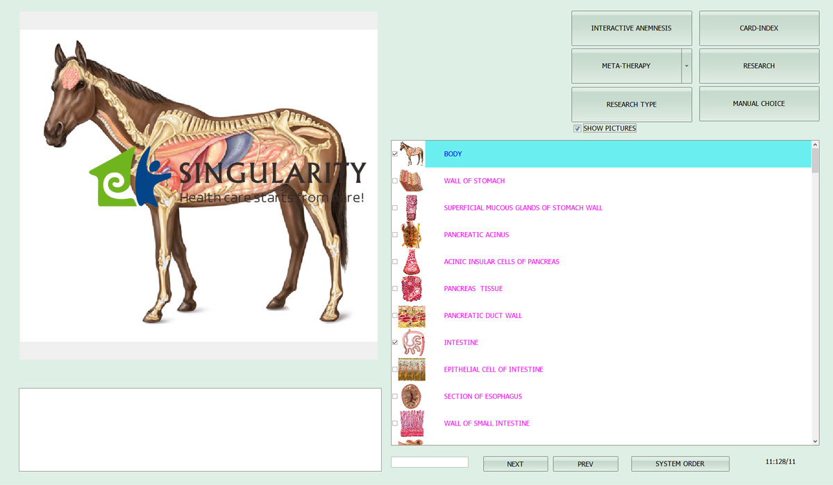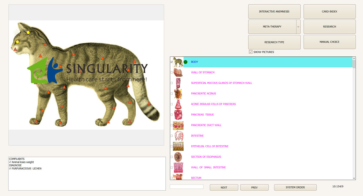 The brain will receive a signal regarding the need to test one or more organs of the body, which signal is displayed on the computer monitor and is captured in the headphones of subject. The signal represents a series of electromagnetic oscillations characteristic of healthy organs. Every cat possesses its own particular spectrum of electromagnetic oscillations. The question regarding the state of the health can be explored, and in response to a question, the subject’s brain provides an answer, which is then perceived by the sensors. The outcome represents the state of the body organism.