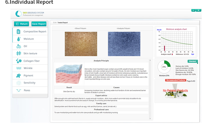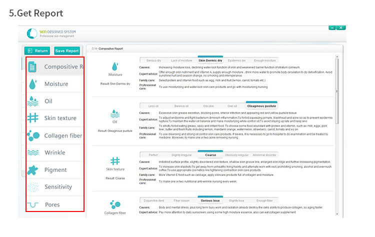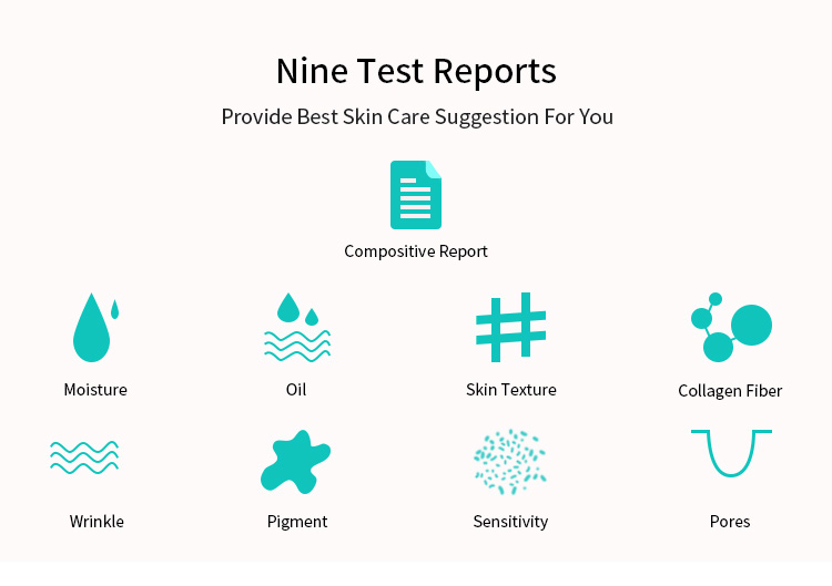 The test result can be divided into compositive report and single item report. Based on the result, each single item report will give analysis theory, forming reasons and put forward corresponding professional suggestions, home skin care suggestions and professional care suggestions, which can be printed out;