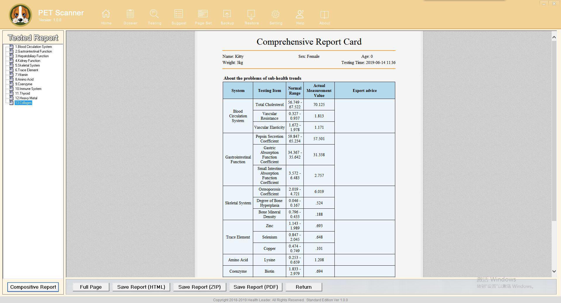 The main analysis items are over 10, Blood Circulation System, Gastrointestinal Function, Hepatobiliary Function, Kidney Function, Skeletal System, Trace Element, Vitamin, Amino Acid, Coenzyme, Immune System, Thyroid, Heavy Metal, Collagen and so on.