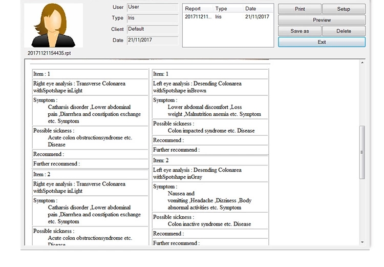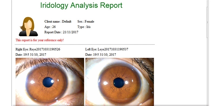2. The software can save the client information and irises also the details of products that you recommend them. After taken the photos, you can analysis the irises and later compare the irises pictures when your client comes back to see their progress. Can print an analysis report. Save the photos according to the date & time you take the photos.3. This machine will help the client know his health condition, including the problem which you have had in the past. The Iridology will be your health counselor, tell you how to keep away from the illness.